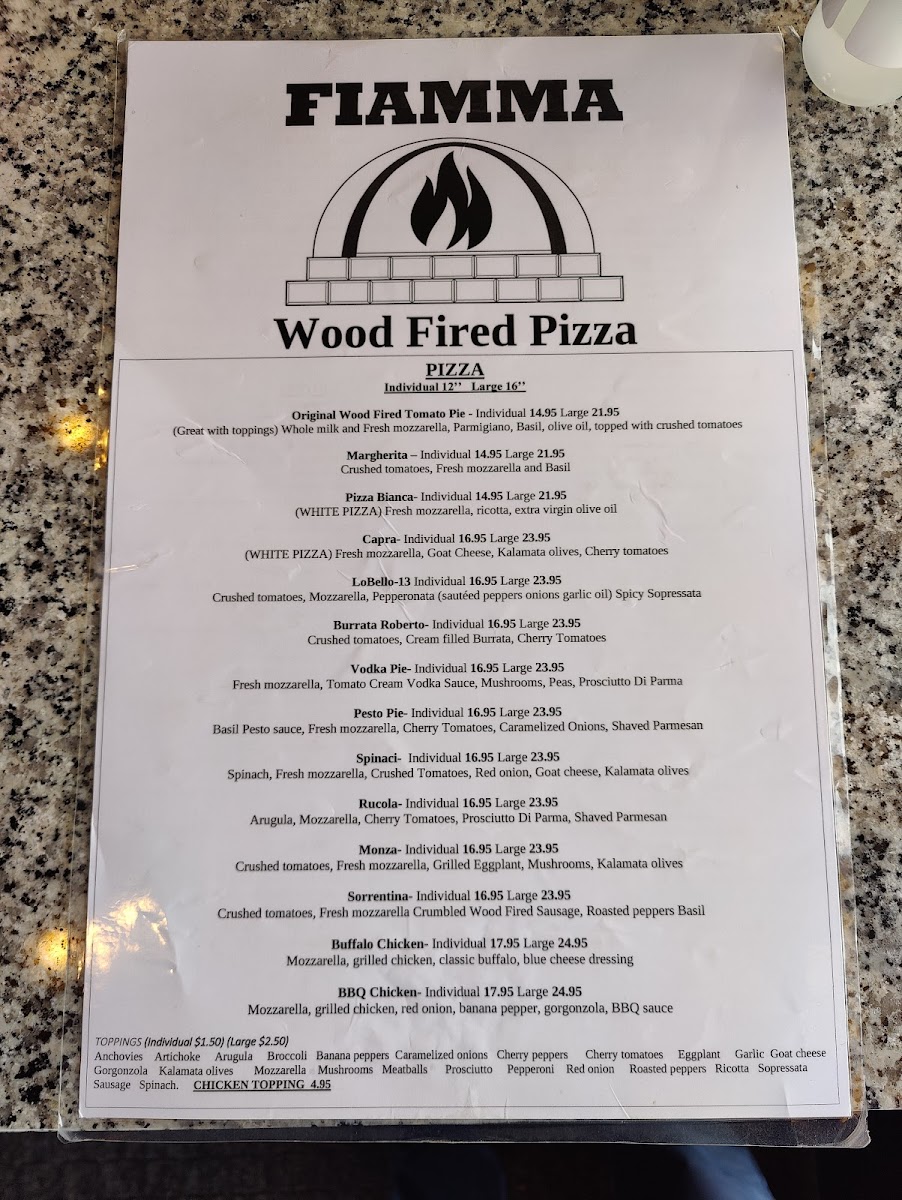 Welcome to Fiamma Wood Fired Pizza, nestled at 32 Main St, Millburn, NJ. This charming eatery offers a delightful menu that celebrates the art of wood-fired cooking. Every pizza is crafted with care, showcasing a variety of flavors, from the classic Margherita to innovative options like the Pesto Pizza. Each dish features a perfectly charred crust that captures a smoky essence, enhancing the fresh toppings and sauces.